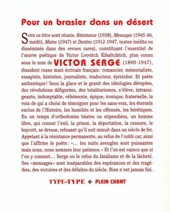 Sous ce titre sont réunis : Résistance (1938), Messages (1945-46, inédit), Mains (1947) et Destins (1912-1947, textes inédits ou disséminés dans des revues rares), constituant l’œuvre poétique de Victor Serge (1890-1947), dissident russe mais écrivain français : romancier, mémorialiste, essayiste, historien, journaliste, traducteur, épistolier. Et poète authentique qui a choisi de témoigner pour les sans-voix, les éternels exclus de l’Histoire, les humiliés et les offensés, les hérétiques. En un temps d’orthodoxie béate ou stipendiée, un homme libre, qui connut l’exil, la prison, la déportation, la censure, le boycott, se dresse, refusant qu’il soit minuit dans un siècle de fer. Serge ou le refus du fatalisme et de la lâcheté. Ses "messages" sont inséparables des espérances et des tragédies, des victoires et des défaites de son siècle, de tous les siècles. Rien n’est jamais fini.